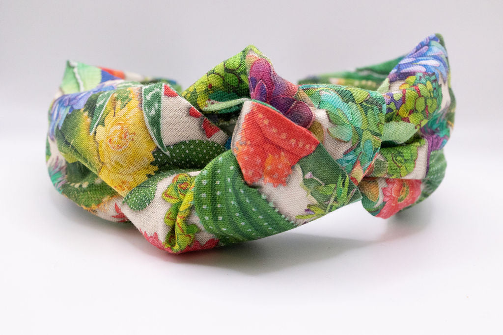 Stylish top knot headband made in a cactus flower cotton fabric. Made with a super flexible band which adjusts to fit most head sizes